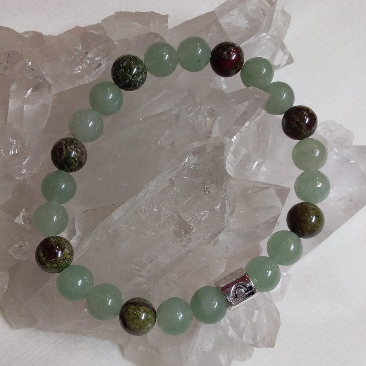 Bracelet signe balance pour homme, composé de perles en aventurine verte et pierre de sang ainsi qu’une perle avec le signe astrologique. Les perles sont d’un diamètre de 8 mm montées sur élastique.